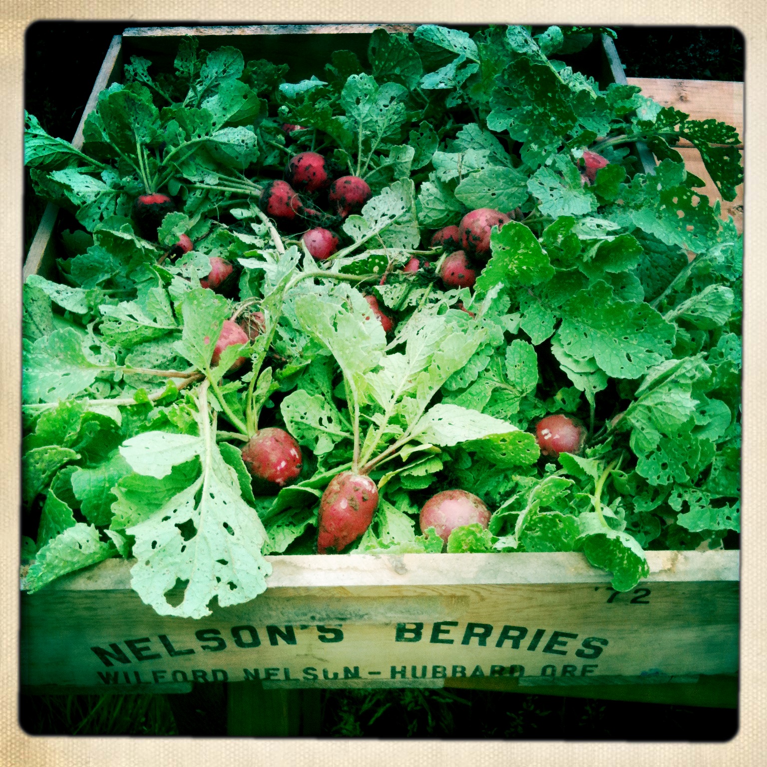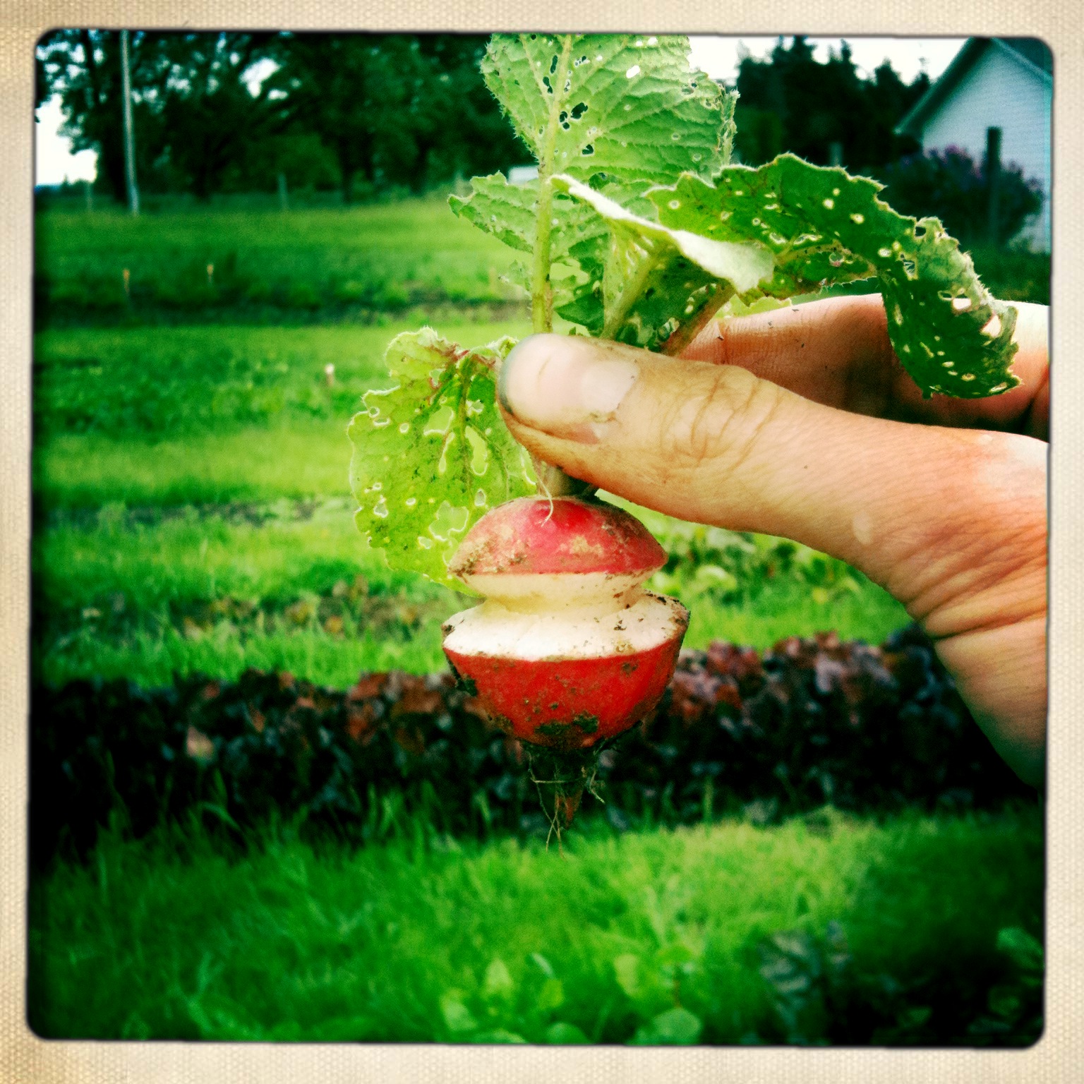 We have just harvested our first radishes; succulent monsters whose green tops scores of cole-loving beetles have feasted upon and whose tender flesh critters have nibbled on. After tasting one, I don’t blame the little pests. They are spicy and delicious (and going in our first CSA box)!